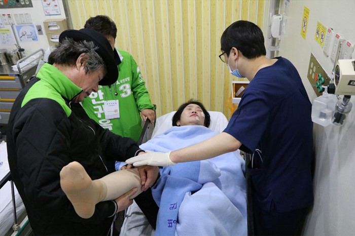 (서울=포커스뉴스) 안귀옥 국민의당 인천 남구을 후보가 5일 오전 새벽 예배를 마친 뒤 선거유세를 위해 이동 중 신원이 밝혀지지 않은 괴한에게 습격을 당했다고 캠프 관계자가 전했다. 사진은 사건 직후 인근 종합병원 응급실에서 치료 중인 안 후보의 모습. <사진제공=안귀옥 후보 선거사무소>