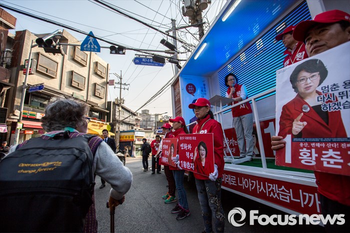 (서울=포커스뉴스) 황춘자 새누리당 용산구 후보가 5일 오후 서울 용산구 이태원동 일대에서 유세를하며 주민들에게 한 표를 호소 하고 있다.