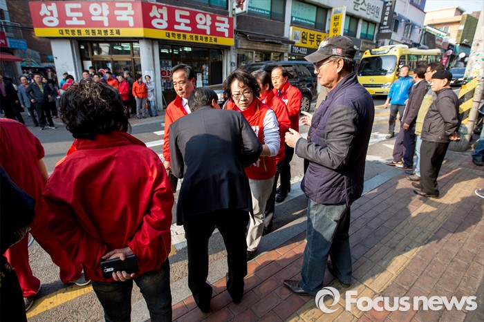 (서울=포커스뉴스) 황춘자 새누리당 용산구 후보가 5일 오후 서울 용산구 이태원동 일대에서 유세를하며 주민들에게 한 표를 호소 하고 있다.