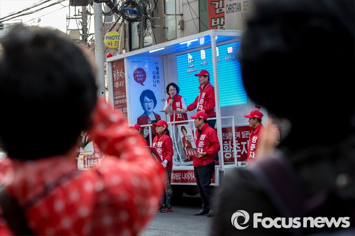 (서울=포커스뉴스) 황춘자 새누리당 용산구 후보가 5일 오후 서울 용산구 이태원동 일대에서 유세를하며 주민들에게 한 표를 호소 하고 있다.