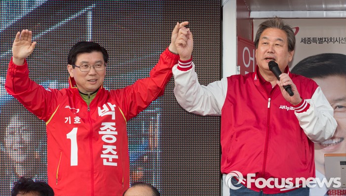 (세종=포커스뉴스) 김무성 새누리당 대표가 5일 오후 세종시 조치원읍 조치원역 앞 교차로에서 박종준 후보의 지지를 호소하고 있다.