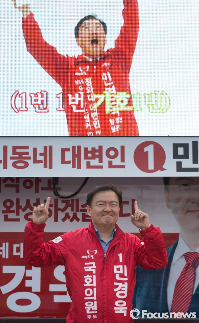 (인천=포커스뉴스) 20대 총선에 출마한 새누리당 민경욱 연수을 후보가 5일 오후 인천 연수구 송도동에서 로고송에 맞춰 선거율동을 선보이고 있다.