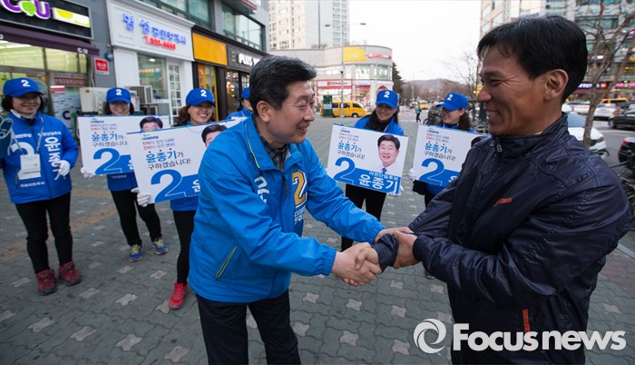 (인천=포커스뉴스) 20대 총선에 출마한 더불어민주당 윤종기 연수을 후보가 5일 오후 인천 연수구 송도역 인근에서 유권자에게 지지를 호소하고 있다.