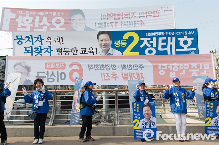 (서울=포커스뉴스) 5일 오후 서울 관악구 삼성동시장 앞에서 정태호 더불어민주당 관악구을 후보 선거운동원들이 지원유세를 하고 있다.