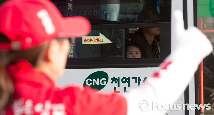 (세종=포커스뉴스) 5일 오후 세종시 조치원읍 조치원역 앞 교차로에서 버스안 어린이가 김무성 새누리당 대표의 유세를 바라보고 있다.