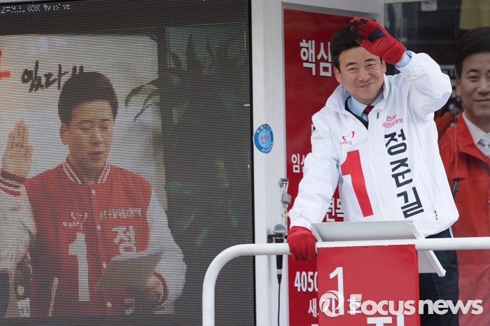 (서울=포커스뉴스) 20대 총선에 출마한 정준길 새누리당 광진을 후보가 5일 오후 서울 건대입구역 인근에서 유권자들에게 지지를 호소하고 있다.