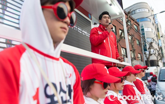 (서울=포커스뉴스) 5일 오후 서울 관악구 김한의원 앞에서 오신환 새누리당 관악구을 후보가 선거유세를 하고 있다.