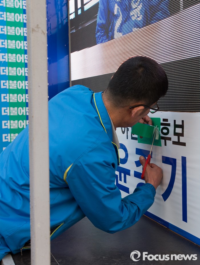 (인천=포커스뉴스) 5일 오후 인천 연수구 송도동 인근에서 윤종기 더불어민주당 연수을 후보 선거사무소 관계자가 유세차량의 야권 단일후보 명칭을 가리고 있다.