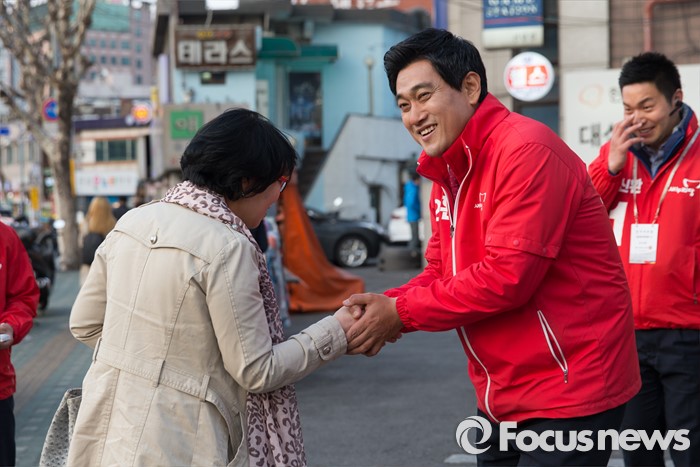 (서울=포커스뉴스) 5일 오후 서울 관악구 김한의원 앞에서 오신환 새누리당 관악구을 후보가 선거유세를 하고 있다.