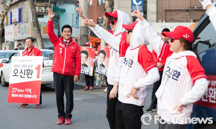 (서울=포커스뉴스) 5일 오후 서울 관악구 김한의원 앞에서 오신환 새누리당 관악구을 후보가 선거유세를 하고 있다.