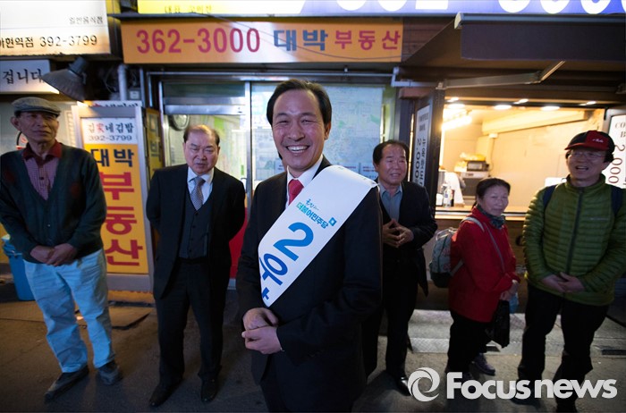 (서울=포커스뉴스) 5일 오후 서울 서대문구 아현역 인근에서 더불어민주당 우상호 서대문갑 후보가 시민들을 만나 유세를 하고 있다.