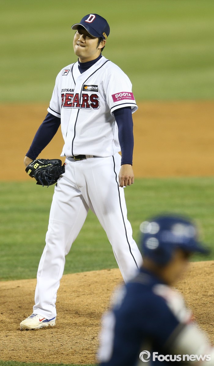 (서울=포커스뉴스) 5일 서울 잠실구장에서 열린 2016프로야구 NC-두산 경기 4회초 2사 1루에서 두산 투수 장원준이 NC 이종욱을 볼넷으로 출루시키며 아쉬운 표정을 짓고 있다. 장원준은 2사후 3연속 볼넷을 허용했다.