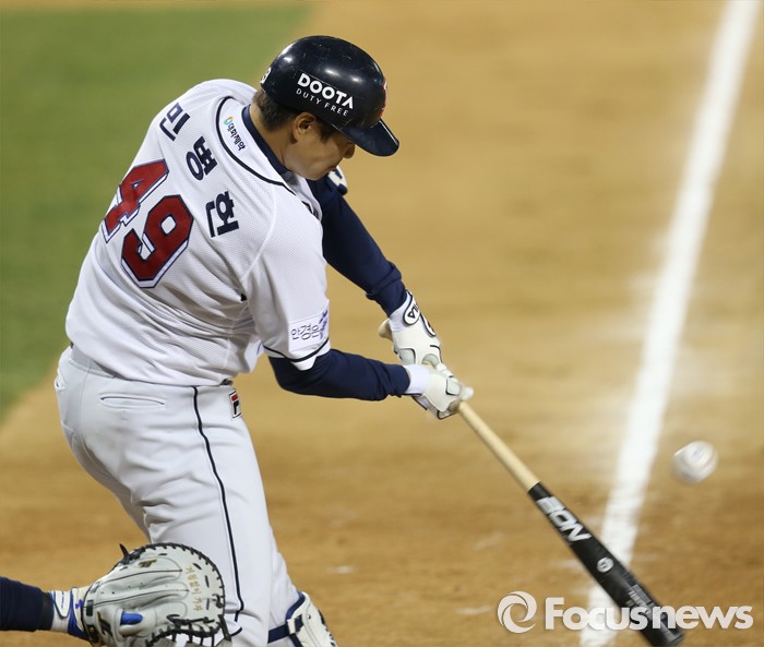 (서울=포커스뉴스) 5일 서울 잠실구장에서 열린 2016프로야구 NC-두산 경기 2회말 2사 1,3루에서 두산 민병헌이 우익수 앞에 떨어지는 안타를 날리고 있다.