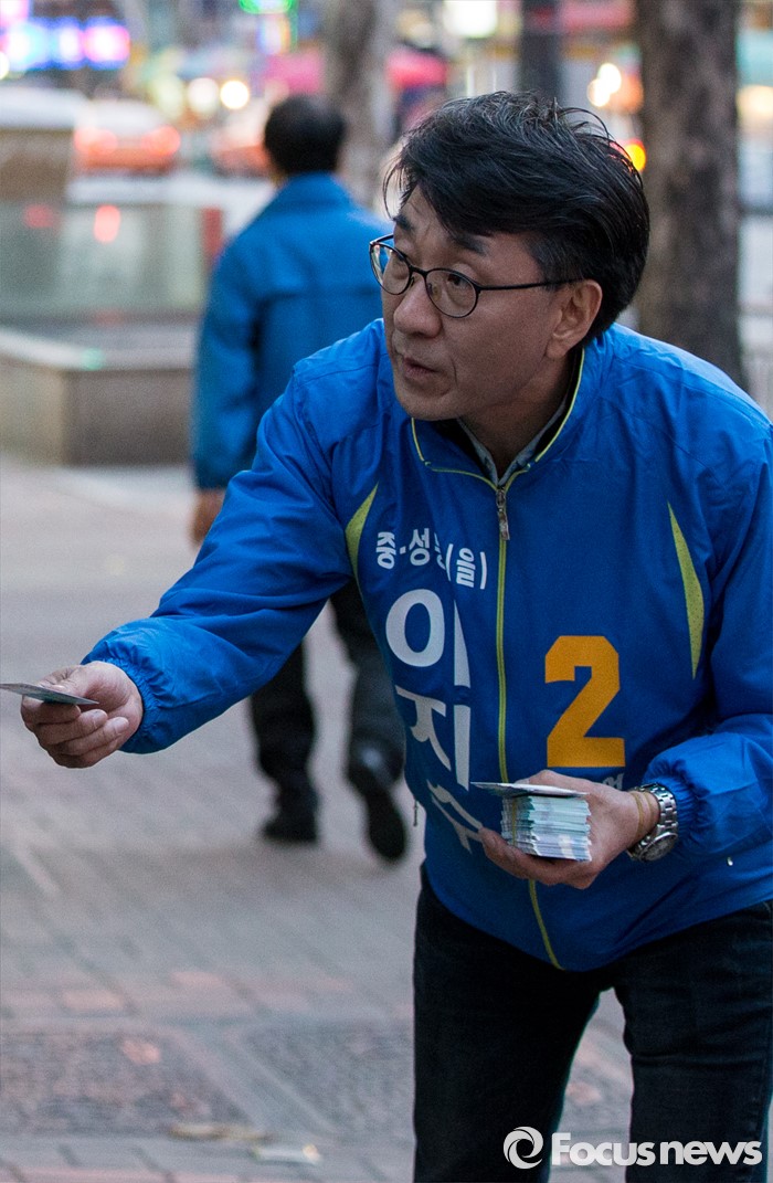 (서울=포커스뉴스) 5일 오후 서울 중구 신당역 인근에서 선거유세에 나선 이지수 더불어민주당 중구성동구을 후보가 퇴근길의 유권자에게 지지를 호소하고 있다.