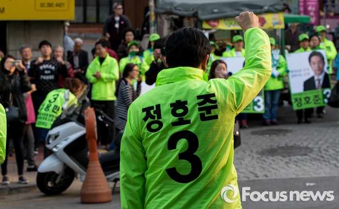 (서울=포커스뉴스) 5일 오후 서울 중구 충정로역 인근에서 선거유세에 나선 정호준 국민의당 중구성동구을 후보가 유권자들의 지지를 호소하고 있다.