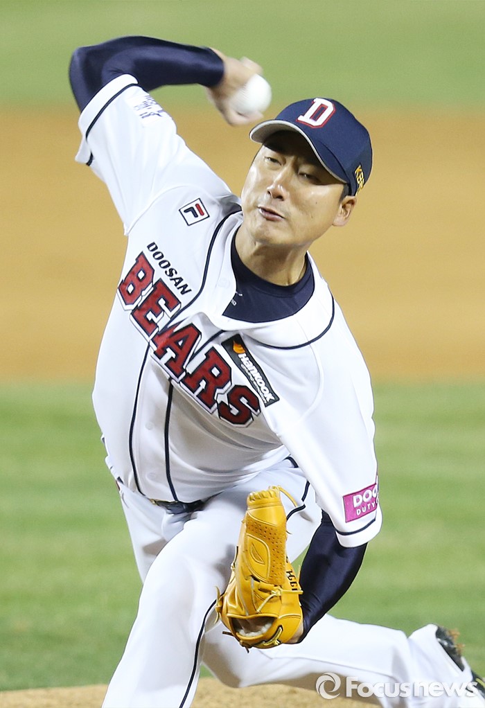 (서울=포커스뉴스) 5일 서울 잠실구장에서 열린 2016프로야구 NC-두산 경기에서 7회 등판한 두산 투수 정재훈이 투구하고 있다.