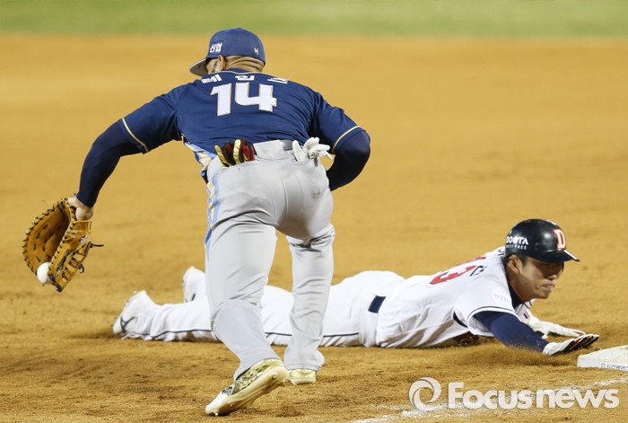 (서울=포커스뉴스) 5일 서울 잠실구장에서 열린 2016프로야구 NC-두산 경기 6회말 몸에 맞는 볼로 진루한 두산 1루주자 허경민이 NC 투수 박준영의 견제구에 귀루하며 세이프되고 있다.