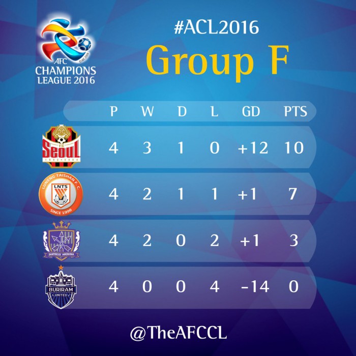 서울이 3승1무(승점 10)로 조 1위에 자리한 가운데 산동은 2승1무1패(승점 7)로 2위를 유지했다. 산프레체 히로시마(일본)는 부리람 유나이티드(태국)를 2-0으로 꺾고 2승2패(승점 6)로 상위권 도약을 기대하게 됐다. 부리람은 4패로 16강 진출이 좌절됐다.아시아축구연맹(AFC) 챔피언스리그 조별라운드 F조 4라운드 종료 현재 순위. <사진출처=아시아축구연맹(AFC) 공식 트위터>
