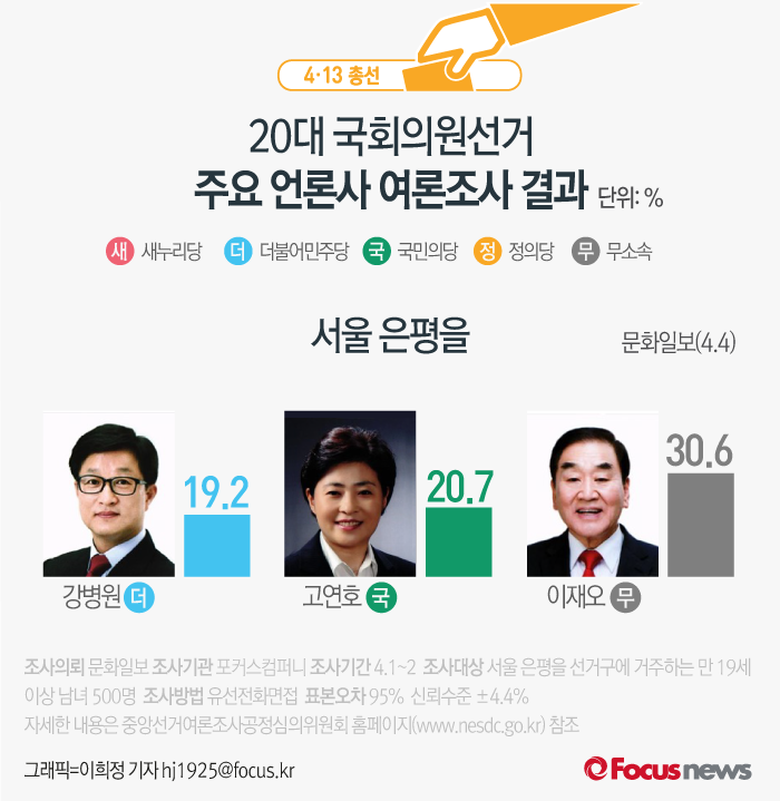 (서울=포커스뉴스) 4·13 총선이 얼마 남지 않았습니다. 각 지역구별로 엎치락 뒤치락 하는 판세인데요. 각 언론사에서 실시한 주요 지역구 여론조사 결과를 살펴 보시죠.