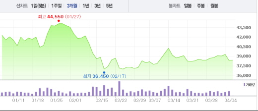 이기훈 하나금융투자 연구원은 “지난해 2NE1의 매출 비중은 2% 정도이고 대부분 음원 저작권 매출”이라며 “탈퇴에 따른 실적 변동성은 전혀 없을 것”이라고 예상했다.주가흐름<사진출처=네이버 캡쳐>