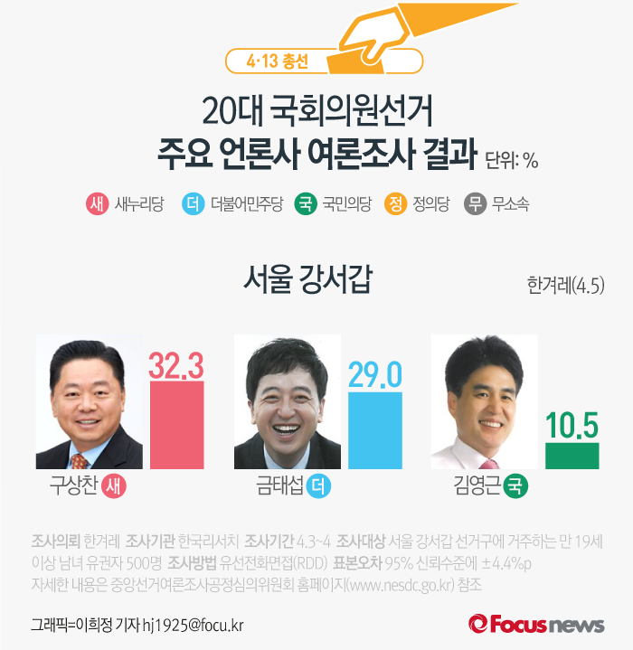 (서울=포커스뉴스) 한겨레가 한국리서치에 의뢰해 5일 발표한 여론조사 결과에 따르면 새누리당 구상찬 후보의 지지율은 32.3%, 더불어민주당 금태섭 후보의 지지율은 29.0%, 국민의당 김영근 후보는 10.5%를 기록했다.