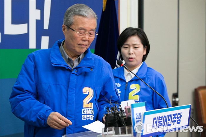 (서울=포커스뉴스) 김종인(왼쪽) 더불어민주당 비대위 대표가 6일 오전 서울 여의도 국회 당대표회의실에서 광주경제살리기 특별기자회견을 위해 입장하고 있다. 오른쪽은 양향자 광주 서구을 후보.