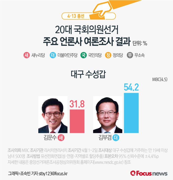 (서울=포커스뉴스) MBC가 여론조사기관 리서치앤리서치에 의뢰해 5일 발표한 결과에 따르면 대구 수성갑에서 더민주 김부겸 후보의 지지율은 54.2%, 새누리당 김문수 후보의 지지율은 31.8%인 것으로 나타났다.