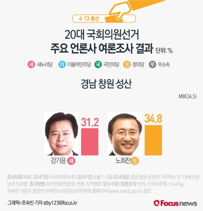 (서울=포커스뉴스) MBC가 여론조사기관 리서치앤리서치에 의뢰해 5일 발표한 결과에 따르면 경남 창원 성산에서 새누리당 강기윤 후보의 지지율은 31.2%, 단일화에 성공한 정의당 노회찬 후보의 지지율은 34.8%인 것으로 나타났다.