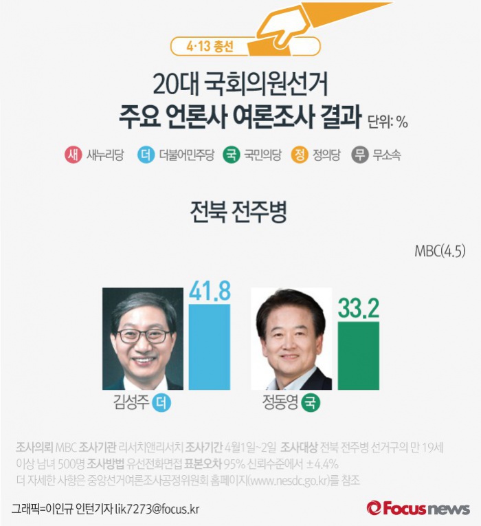 (서울=포커스뉴스) MBC가 여론조사기관 리서치앤리서치에 의뢰해 5일 발표한 결과에 따르면 전북 전주병에서 더불어민주당 김성주 후보의 지지율은 41.8%, 국민의당 정동영 후보의 지지율은 33.2%인 것으로 나타났다.