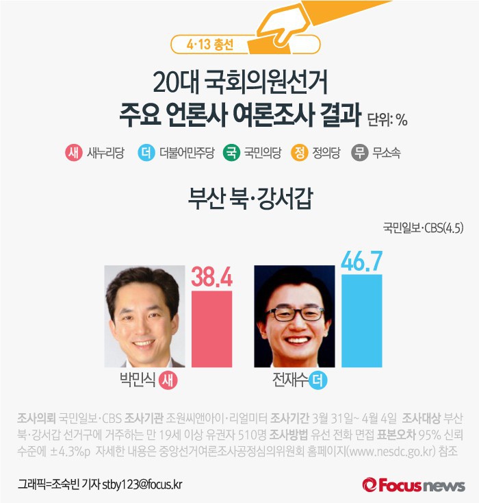 (서울=포커스뉴스) MBC가 여론조사기관 리서치앤리서치에 의뢰해 5일 발표한 결과에 따르면 부산 북·강서갑에서 새누리당 박민식 후보의 지지율은 38.4%, 더민주 전재수 후보의 지지율은 46.7%인 것으로 나타났다.