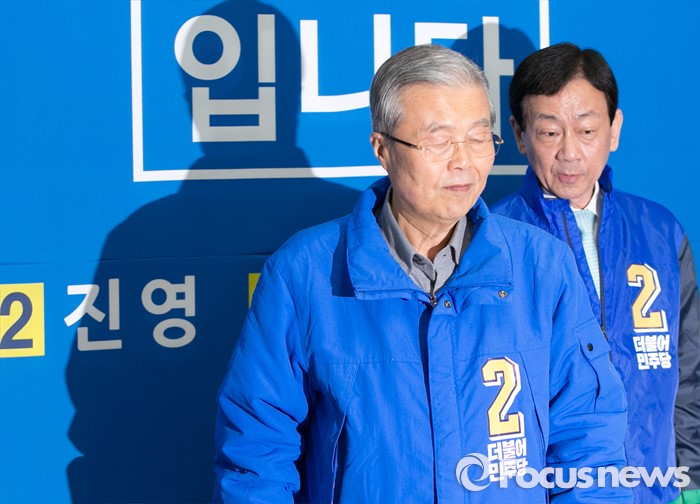 (서울=포커스뉴스) 6일 오전 진영 더불어민주당 서울 용산구 후보 선거사무소에서 열린 중앙선거대책위원회의에 김종인(왼쪽) 비대위 대표 겸 선대위원장와 진 후보가 참석하고 있다.