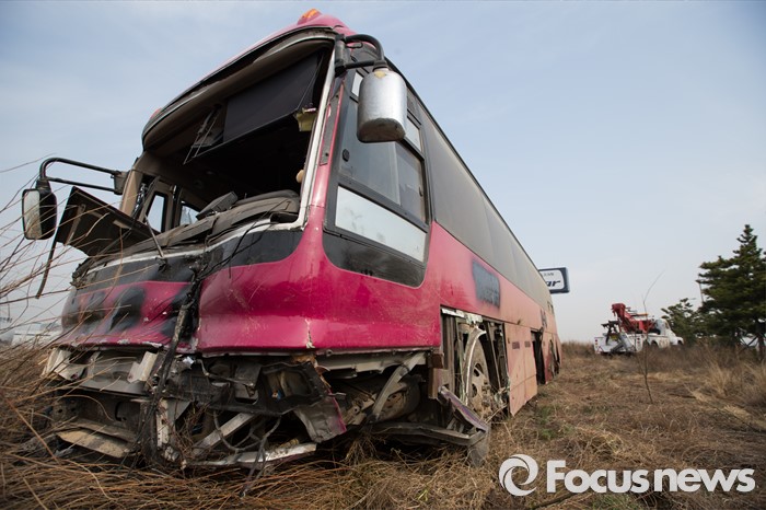 (인천=포커스뉴스) 6일 오전 인천국제공항고속도로에서 통근버스가 전복되는 사고가 발생, 견인작업을 기다리고 있다.
