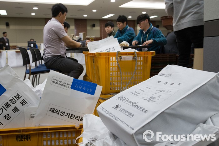 (인천=포커스뉴스) 제20대 국회의원선거 재외투표 우편물 접수 시작일인 6일 오전 인천 중구 국제우편물류센터에서 직원들이 재외투표 회송 우편물을 분류하고 있다.