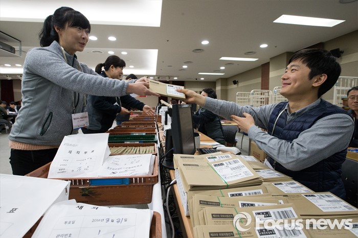 (인천=포커스뉴스) 제20대 국회의원선거 재외투표 우편물 접수 시작일인 6일 오전 인천 중구 국제우편물류센터에서 직원들이 재외투표 회송 우편물을 접수하고 있다.