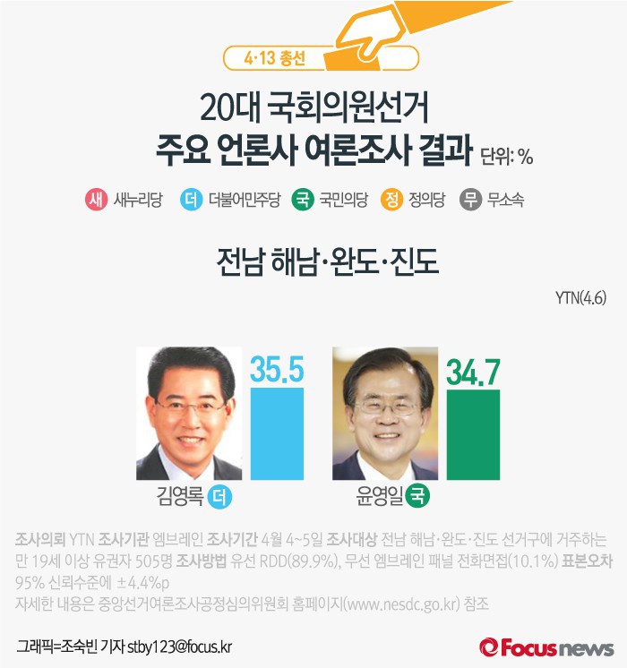 (서울=포커스뉴스) YTN이 여론조사기관 엠브레인에 의뢰해 6일 발표한 결과에 따르면 전남 해남·완도·진도에서 더민주 김영록 후보의 지지율은 35.5%, 국민의당 윤영일 후보의 지지율은 34.7%인 것으로 나타났다.