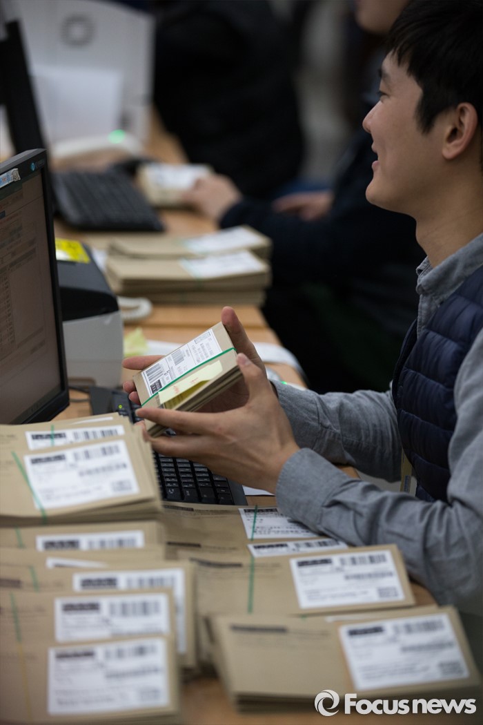 (인천=포커스뉴스) 제20대 국회의원선거 재외투표 우편물 접수 시작일인 6일 오전 인천 중구 국제우편물류센터에서 직원들이 재외투표 회송 우편물을 접수하고 있다.