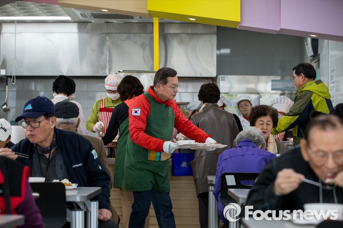 (서울=포커스뉴스) 안대희 새누리당 마포구갑 후보가 6일 오전 서울 마포구 용강노인복지회관에서 배식봉사를 하고 있다.