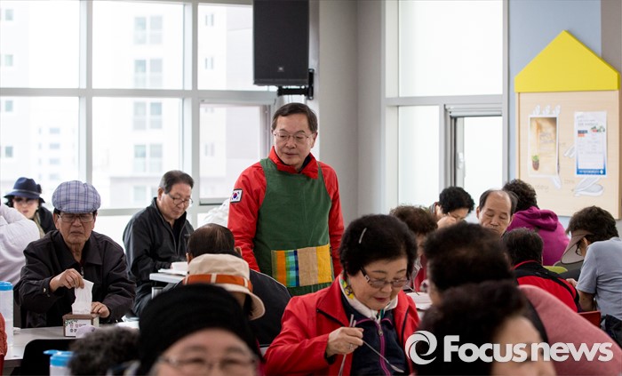 (서울=포커스뉴스) 안대희 새누리당 마포구갑 후보가 6일 오전 서울 마포구 용강노인복지회관에서 배식봉사를 하고 있다.