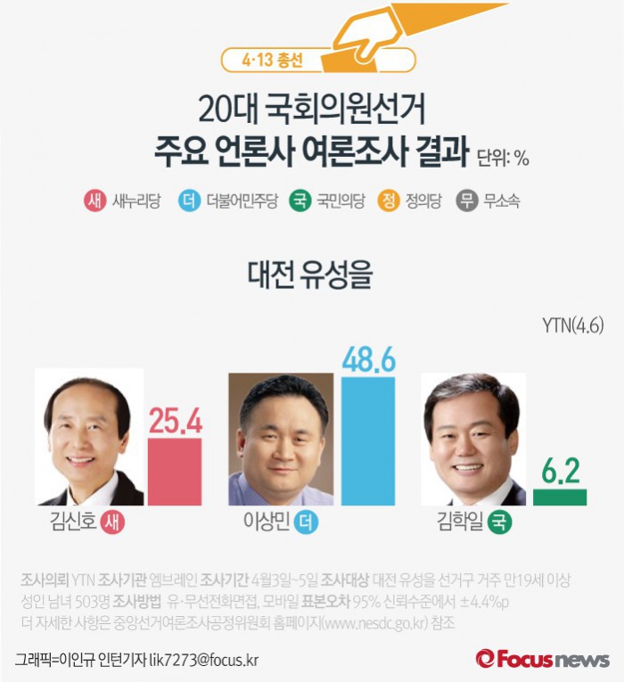 (서울=포커스뉴스) YTN이 여론조사기관 엠브레인에 의뢰해 6일 발표한 결과에 따르면 대전 유성을의 지지율은 새누리당 김신호 후보(25.4%), 더불어민주당 이상민 후보(48.6%), 국민의당 김학일 후보(6.2%) 순인 것으로 나타났다.