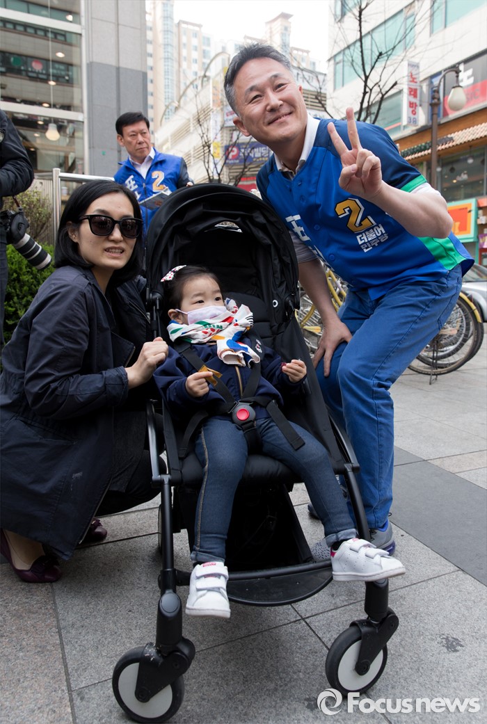(용인=포커스뉴스) 6일 오전 경기 용인 기흥구 보정동 인근에서 표창원 더불어민주당 용인시정 후보가 시민들과 기념촬영을 하고 있다.