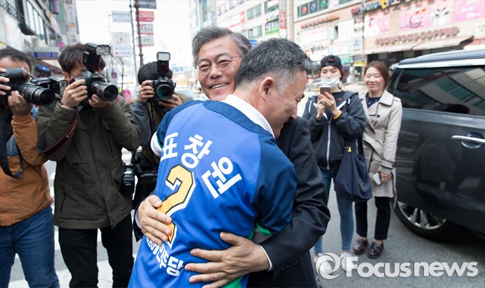 (용인=포커스뉴스) 6일 오전 경기 용인 기흥구 보정동 인근에서 문재인 더불어민주당 전 대표가 표창원 더민주 용인시정 후보와 포옹을 하고 있다.