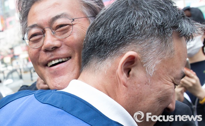 (용인=포커스뉴스) 6일 오전 경기 용인 기흥구 보정동 인근에서 문재인 더불어민주당 전 대표가 표창원 더민주 용인시정 후보와 포옹을 하고 있다.