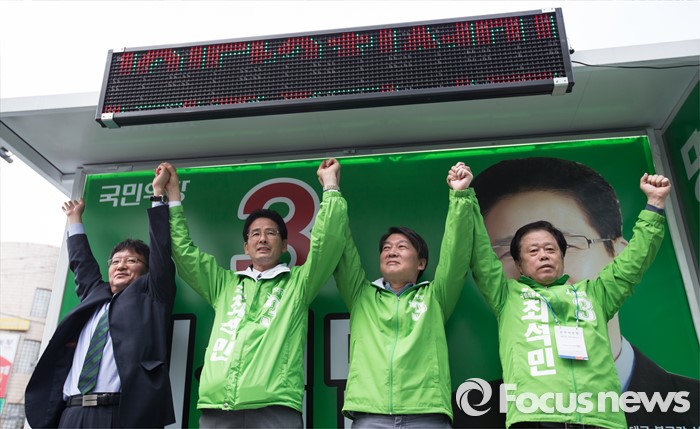(대구=포커스뉴스) 안철수 국민의당 상임공동대표(오른쪽 두번째)와 최석민 후보(왼쪽 두번째)가 6일 오후 대구광역시 북구 경북대학교 앞에서 파이팅 세레머니를 하고 있다.