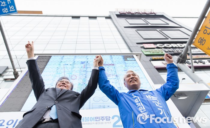 (용인=포커스뉴스) 6일 오후 경기 용인 처인구 김량장동 롯데시네마 앞에서 문재인 더불어민주당 전 대표가 백군기 더민주 용인시갑 후보 지원유세를 하고 있다.