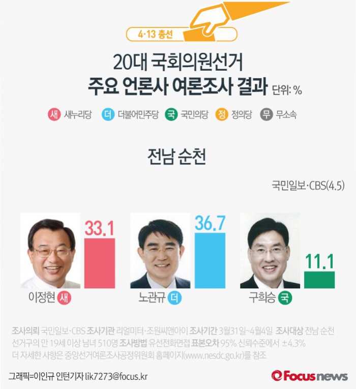 (서울=포커스뉴스) 국민일보·CBS가 여론조사기관 리얼미터·조원씨앤아이에 의뢰해 5일 발표한 결과에 따르면 전남 순천의 지지율은 새누리당 이정현 후보(33.1%), 더불어민주당 노관규 후보(36.7%), 국민의당 구희승 후보(11.1%) 순인 것으로 나타났다.