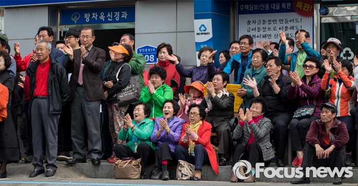 (당진=포커스뉴스) 6일 오후 충남 당진 구 버스터미널 사거리에서 열린 김무성 새누리당 대표, 김동완 당진시 후보 지원유세장에서 유권자들이 김 대표의 지지연설을 듣고 있다.