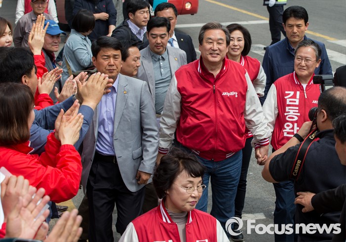(당진=포커스뉴스) 6일 오후 충남 당진 구 버스터미널 사거리에서 김무성(왼쪽) 새누리당 대표가 김동완 당진시 후보의 손을 잡고 지원유세장으로 향하고 있다.
