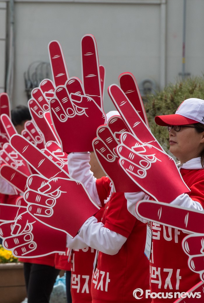 (당진=포커스뉴스) 6일 오후 충남 당진 구 버스터미널 사거리에서 열린 김무성 새누리당 대표, 김동완 당진시 후보 지원유세장에서 선거 사무원들이 유권자들의 지지를 호소하고 있다.