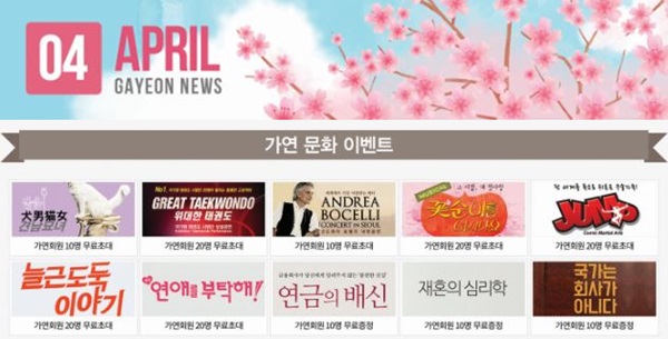 가연 관계자는 "4월 문화이벤트 마련, 봄을 맞아 거리로 나선 회원들의 문화 생활을 책임진다"며 "모든 공연 티켓은 1인 2매로 제공되며, 도서는 10명에게 무료 증정된다"고 밝혔다.가연이 4월 문화이벤트를 진행한다.<사진제공=가연>