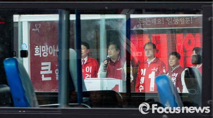 (아산=포커스뉴스) 6일 오후 충남 아산 충무로에서 이명수 새누리당 아산시갑 후보 지원유세에 나선 김무성 대표가 유권자들에게 지지를 호소하고 있다.